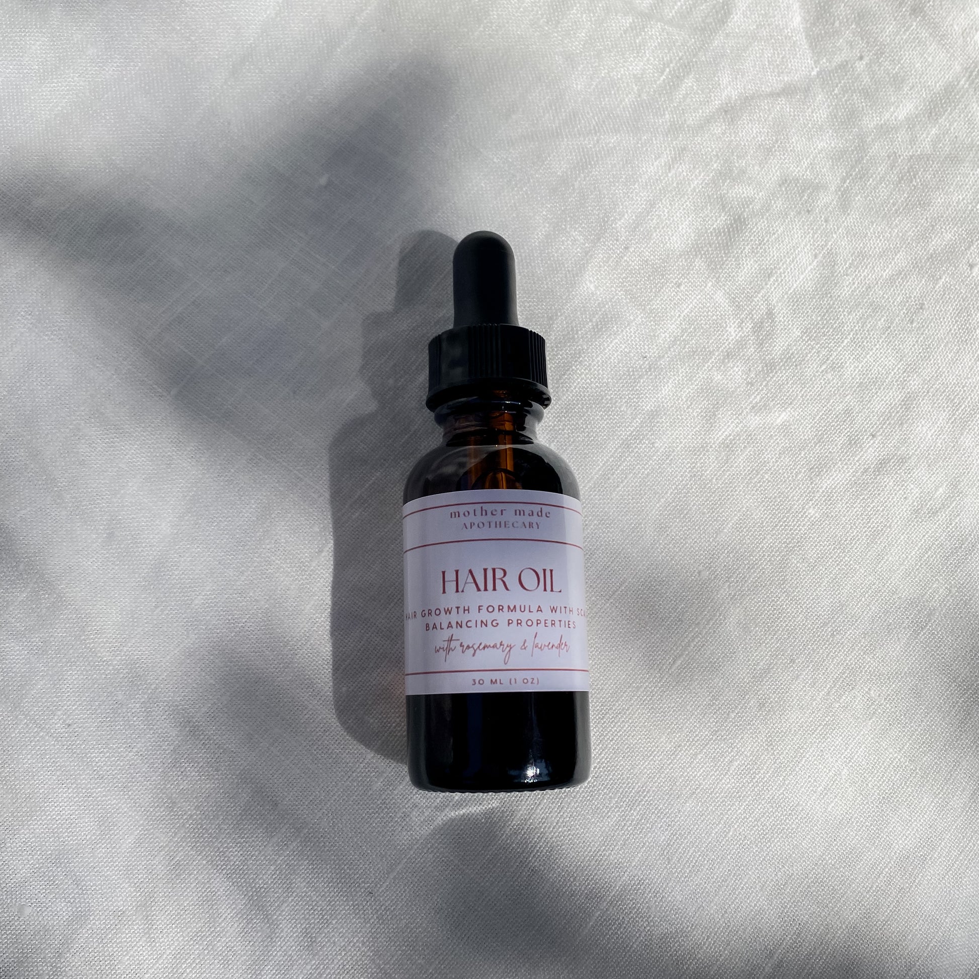 Mother Made hair oil is a hair growth formula with scalp balancing properties. It will hydrate and lock moisture into the ends of the hair as well as stimulate hair growth and balance ph of scalp. This is a powerful oil and a little bit goes a long way, for best results use 1-2 drops on ends of hair daily and oils and massage scalp once a week. Hair oiling is an ancient Ayurvedic practice and dates back thousands of years. Scalp massage increases blood flow to the head and hair follicles and plays a big role in promoting hair growth. The ingredients in the oil are specifically chosen to help with dandruff, increase hair growth, heal damaged hair and protect against UV rays and heat.